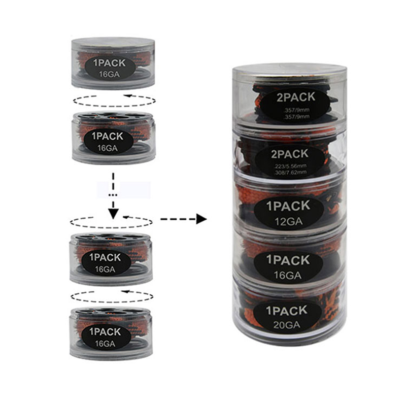 गन क्लिनिङ बोर रोप स्नेक मल्टिलेयर प्याक। DIY। क्यालिबर र मात्रा संयोजन गन क्लिनिङ बोर स्नेक रोप्स मल्टिलेयर संयोजन, यो बहु-तह सिलिन्डर विभिन्न क्यालिबरहरूमा धेरै बोर स्नेक गन सफा गर्ने डोरीहरू मिलेर बनेको छ। यो भण्डारण र संग्रह को लागी सुविधाजनक छ। भित्री कोर डोरी घुमाउने कोरको रूपमा मात्र होइन, तर तान्ने ह्यान्डलको रूपमा पनि प्रयोग गर्न सकिन्छ। यस्तो बेलनाकार प्याकेज एकल प्याकेज भन्दा फेला पार्न सजिलो छ। डिजाइन रोची द्वारा पेटेन्ट गरिएको हो।