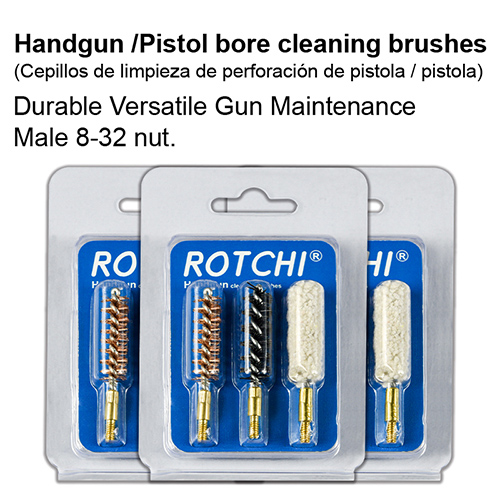 ह्यान्डगन बोर सफाई ब्रश 3-in-1 सेट, ब्लिस्टर र कार्ड प्याकेज। उपलब्ध आकारहरू: .22, 9mm, .40, .45cal।