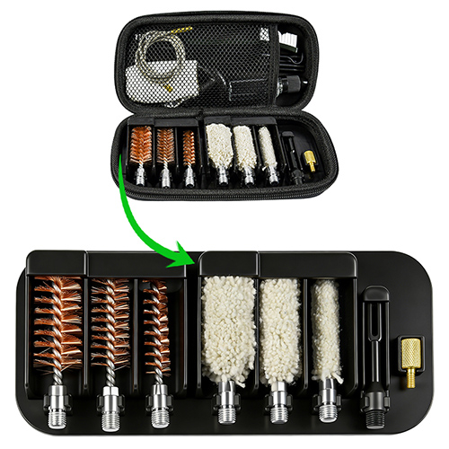शटगन सफा गर्ने किटमा 3 साइजहरू (12/16G, 20G, 410) समावेश छन्। पीतल ब्रश र कपास मोप्स, 4 रड 1 calbe। बालुवा र छनोटहरूको लागि कालो रंग।